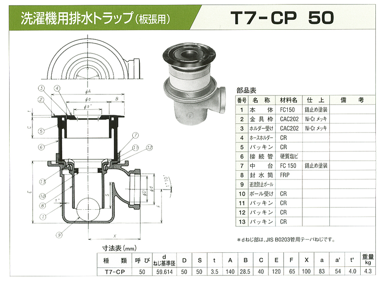 洗濯機用排水トラップ(板張用) T7-CP 50